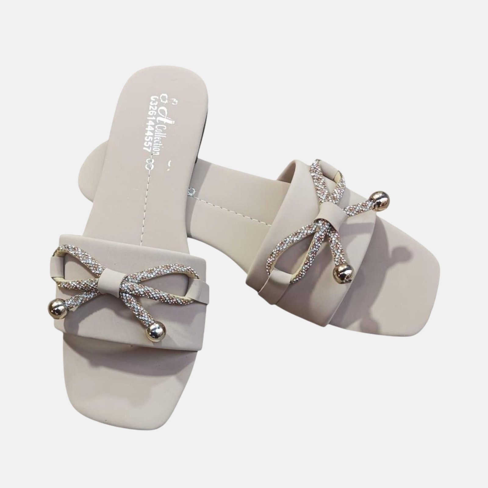 Step out in style and comfort with these Chic Nude Diamante Bow Flat Slides. The minimalist design features a fashionable square toe and a wide, soft nude beige strap that securely holds the foot. The sandal is beautifully enhanced by a decorative diamante-encrusted bow with subtle gold metallic beads at the center, adding a touch of sparkle and glamour to a casual shoe. The flat sole ensures all-day comfort, making them perfect for everyday errands, casual office wear, or a relaxed evening out. A versatile wardrobe essential that pairs beautifully with eastern and western attire.