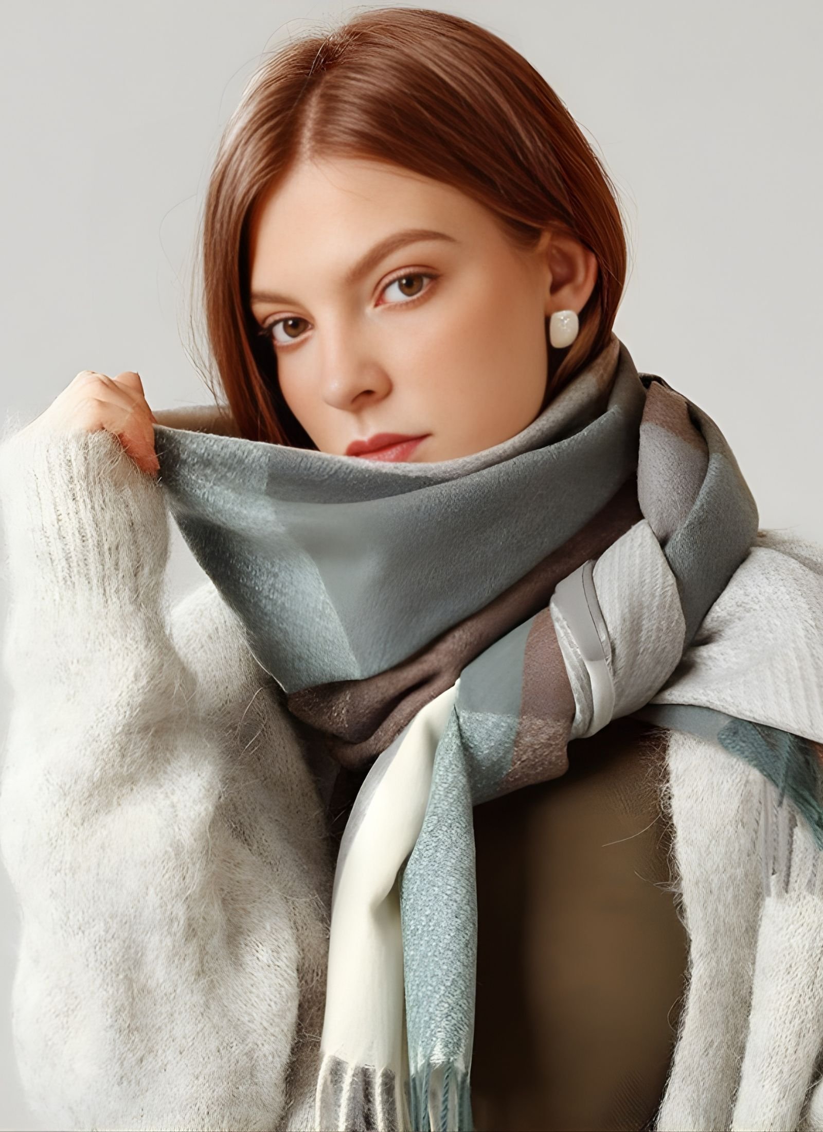 This plush accessory is an oversized, warm shawl or scarf made from a thick, cozy material (likely a wool or cashmere blend) ideal for wrapping up in cold weather. The design is a contemporary plaid/checkered pattern with broad blocks of color, combining sophisticated shades of dusty sage green, warm taupe/brown, light gray, and cream white. The ends of the scarf are finished with a delicate, short fringe. Its generous size makes it versatile: it can be loosely draped over the shoulders as a shawl or wrapped snugly around the neck for maximum warmth and style.